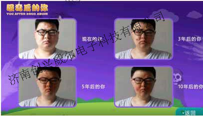 2、软件人脸吸毒变化仿真模块:摄像头捕捉人脸拍照,之后通过数字图像处理软件可以呈现你吸毒3年、5年、10年后的模样,触目惊心的容貌变化,直观的体现了毒品的危害性。