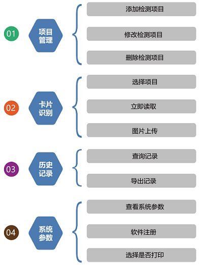 创兴迅检测软件是我公司基于安卓系统研发的一款可进行胶体金试剂卡检测的手机APP。通过手机摄像头对检测试剂卡进行拍照并快速进行分析比色,3秒内即可获取检测结果,并可保存检测数据、照片及图谱。支持胶体金单联卡、二联卡、三联卡等多种检测卡类型,具有项目管理、卡片识别、历史记录、系统参数4个功能模块。
