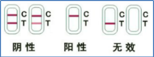3.无效:控制区(C)无色带出现。任何情况下,控制区(C)均应出现一条紫红色条带,如控制区无紫红色条带出现,表明发生操作错误或试剂盒变质失效,应重新检测。