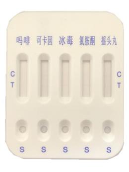 摇头丸(MDMA)检测试纸条由包被有金标摇头丸单克隆抗体的聚酯纤维素膜、包被有摇头丸-BSA 结合物(T 线)及羊抗鸡 LGY 多克隆抗体(C 线)的硝酸纤维素膜、聚合物材料硬板组成。