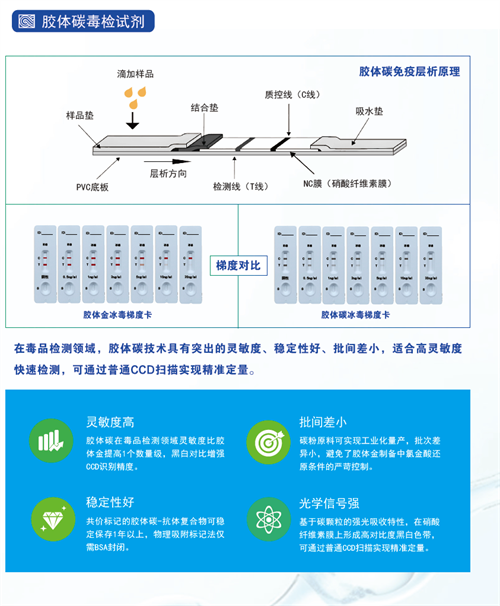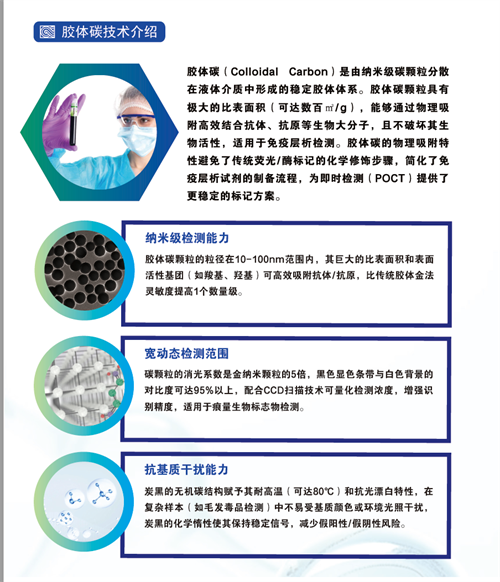 胶体碳(Colloidal Carbon)是由纳米级碳颗粒分散在液体介质中形成的稳定胶体体系。胶体碳颗粒具有极大的比表面积(可达数百㎡/g),能够通过物理吸附高效结合抗体、抗原等生物大分子,且不破坏其生物活性,适用于免疫层析检测。胶体碳的物理吸附特性避免了传统荧光/酶标记的化学修饰步骤,简化了免疫层析试剂的制备流程,为即时检测(POCT)提供了更稳定的标记方案。